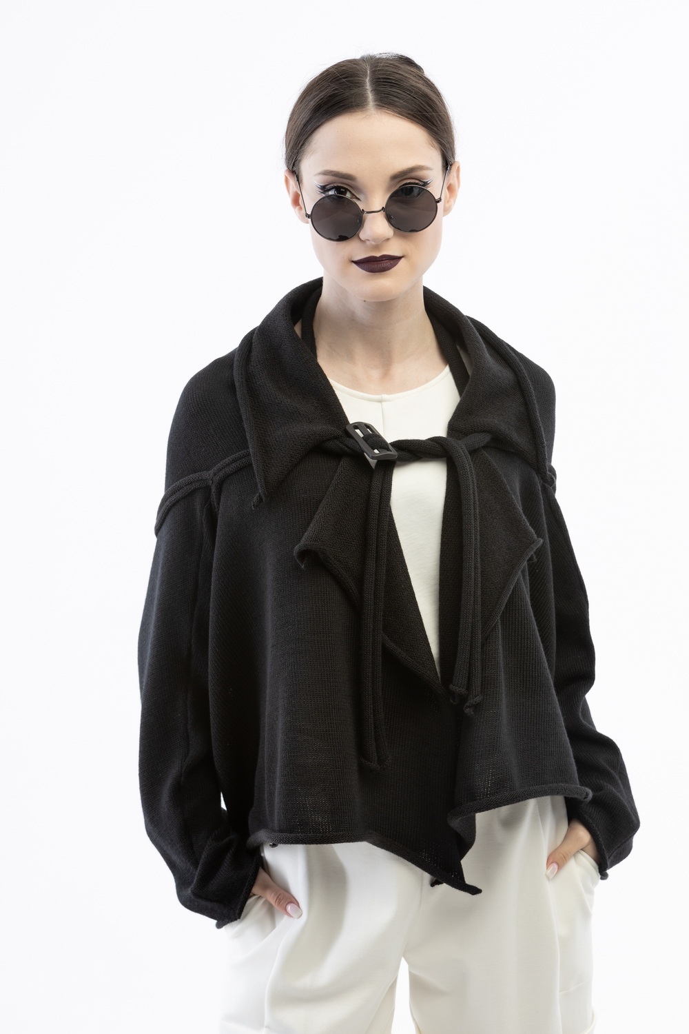 Ассортимент: вязаные кардиганы с застежкой на пуговки (дабы не облегчить работу мужчине), кардиганы с лацканами и с поясом (рекомендую носить поверх белых офисных рубашек оверсайз), джемперы-поло, джемперы-трансформеры 3в1, жилеты-кардиганы с поясом, прямые брюки классического кроя и брюки-импровизация с множеством карманов (созданы из выпадов ткани после раскроя, что поддерживает экологическую составляющую бренда). Каждые брюки индивидуальны и неповторимы, как спонтанная импровизация, сотканная из ощущений и эмоций. Аксессуары – галстуки-пояса с пряжкой, колье из авторской фактуры ткани ЮЛА/YULA, шапки-спирали-оригами, шапки-распальцовки, шапки КиШ, шапки-носки, бактусы, митенки с обшлагами, чулки.