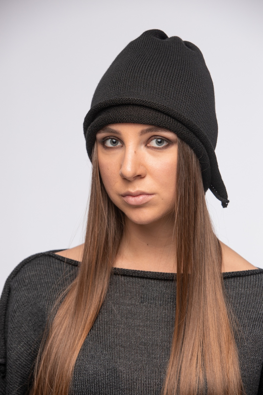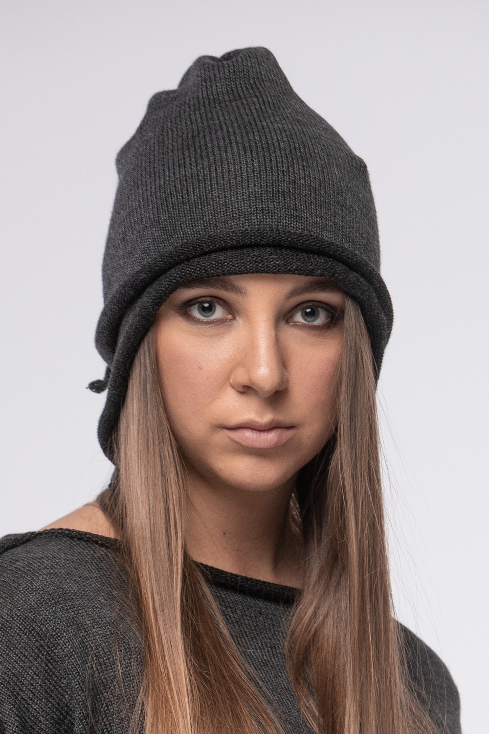Шапочка-бандана-трансформер двусторонняя, внутри резиновый шнур с фиксатором, вязаная на машине платтингом, цвет мышиный/черный (лицо – 2мышиный меринос, изнанка – 1черная Нежность), 3 нити, высота 24см, обхват головы 56-58см, 33меринос, 33акрил, 16хлопок, 18вискоза. 100гр.