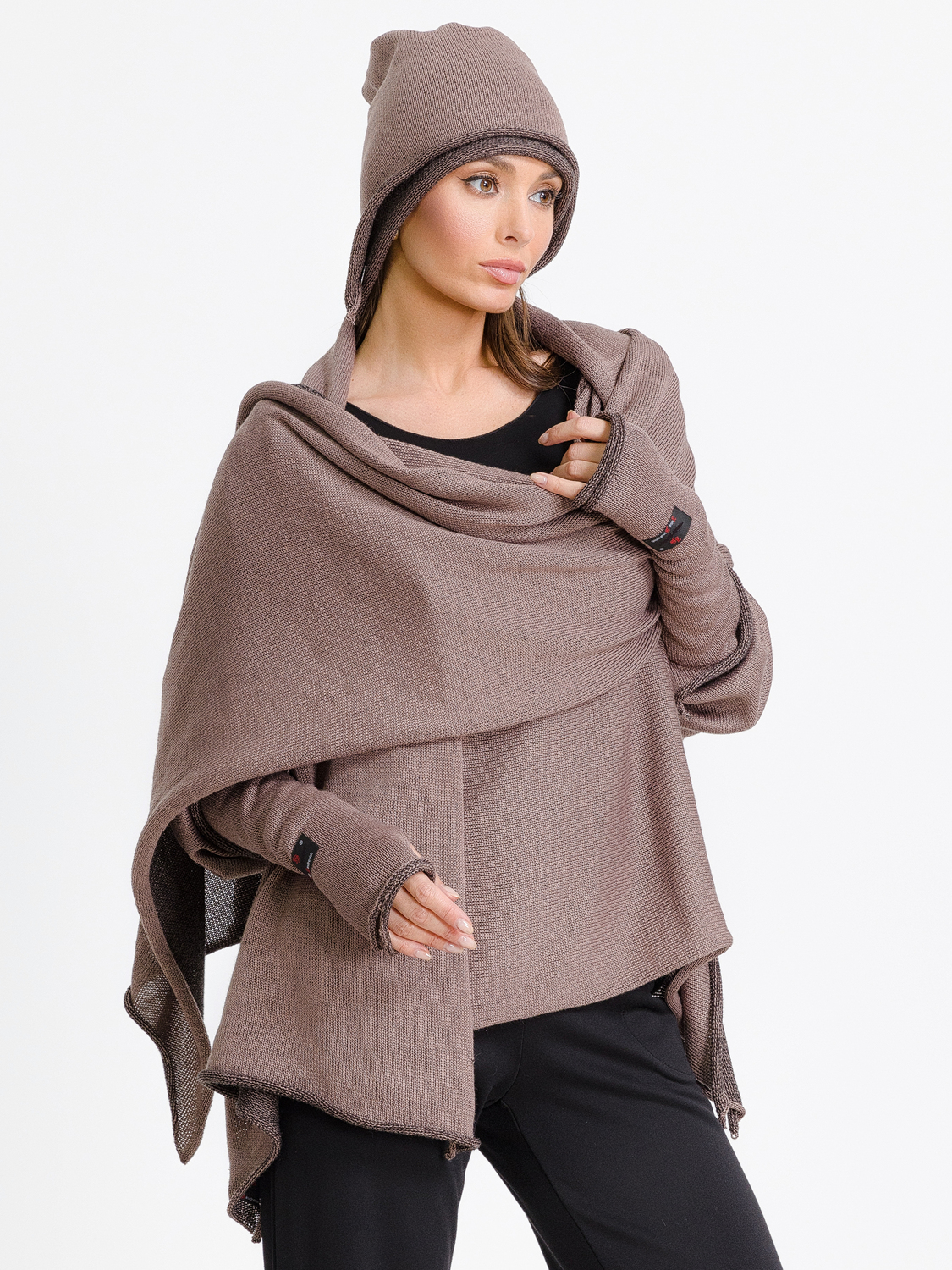Шапочка-бандана-трансформер двусторонняя, внутри резиновый шнур с фиксатором, вязаная на машине платтингом, цвет какао/черный (лицо – 2какао меринос, изнанка – 1черный Нежность), 3 нити, высота 24см, обхват головы 56-58см, 33меринос, 33акрил, 16хлопок, 18вискоза.
