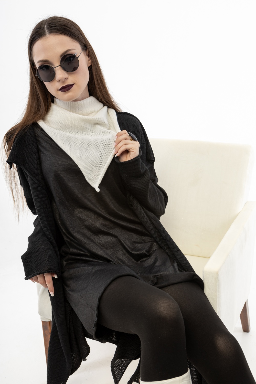 Бактус-бандана треугольная, вязаная на машине платтингом, цвет белый/белый (лицо – 2белый меринос, изнанка – 1белый Нежность), 3 нити, размер 75см х 150см, 66меринос, 16хлопок, 18вискоза. 130гр.