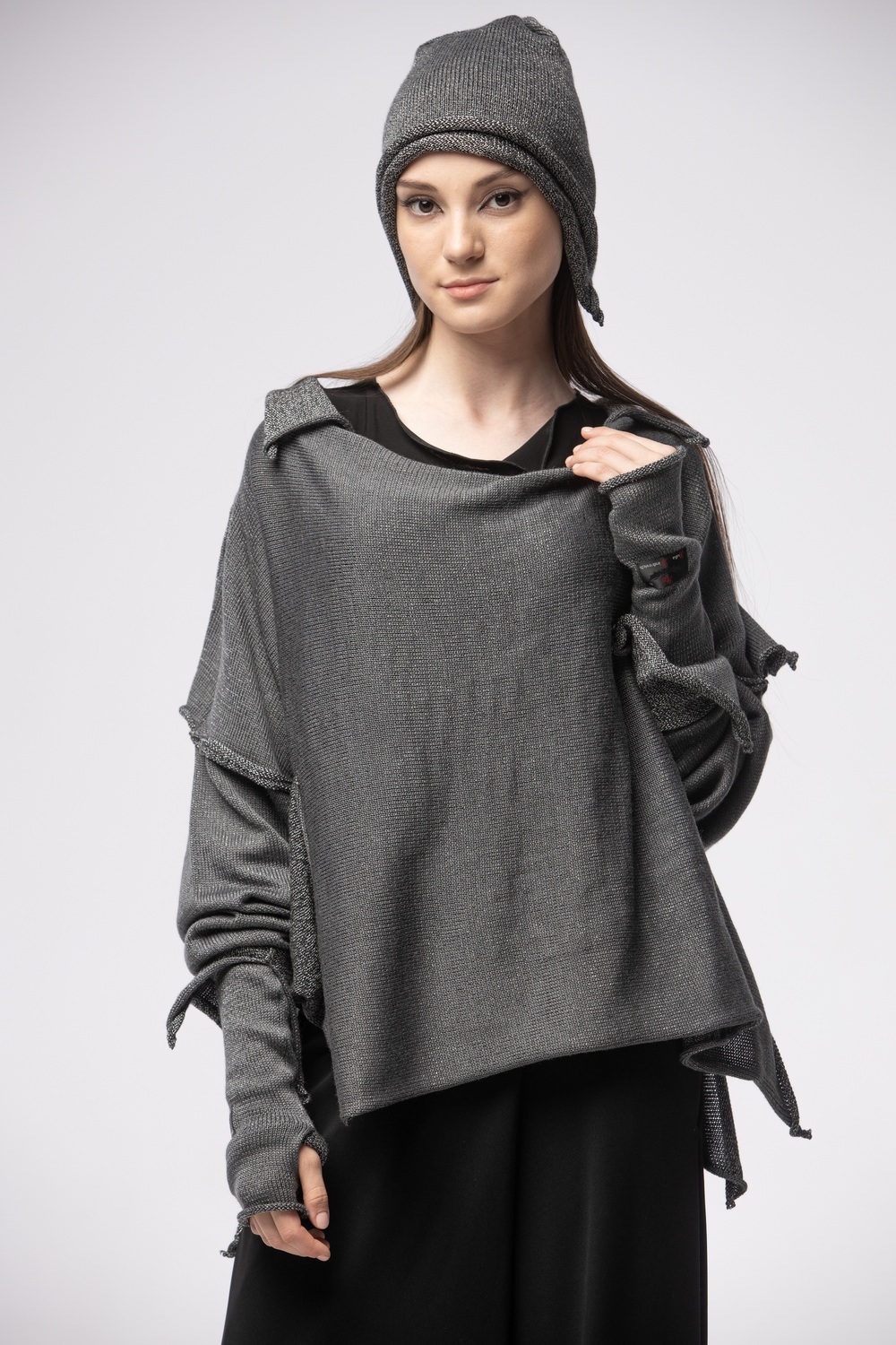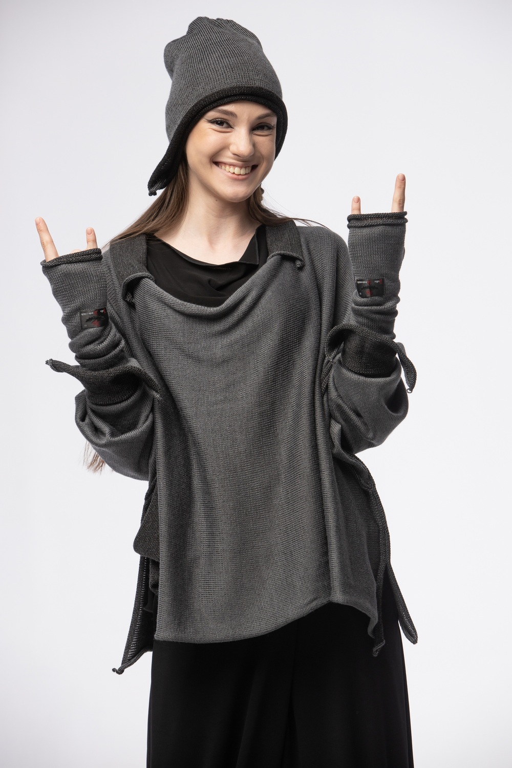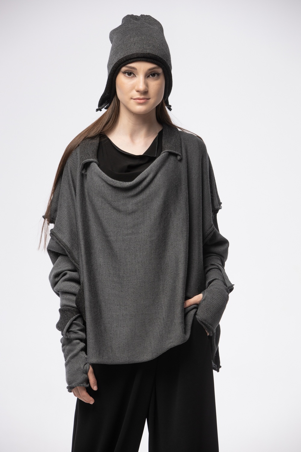 · с контрастным карманом, который при трансформации и надевании джемпера вверх ногами превращается в декоративную деталь с формой крыла летучей мыши.